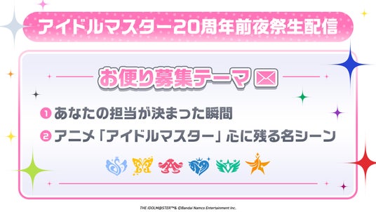 「アイドルマスター20周年前夜祭生配信」では、プロデューサーのみなさまのおたよりを募集いたします!