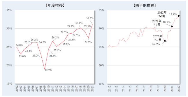 新型コロナウイルスの感染が拡大を始めた2020年1-3月期を起点に大きく水準を切り下げたが、翌年2021年1-3月期には概ね感染拡大前の水準近くに復した。足元2022年7-9月期は、そこから更に伸長を続けており、最高値を更新している※1。