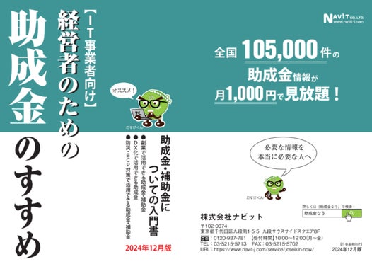 2025/1/11(土)より、【IT事業者向け】「経営者のための助成金のすすめ」(2024年12月版)の販売が開始しております。助成金なうでは申請サポートを承っております。