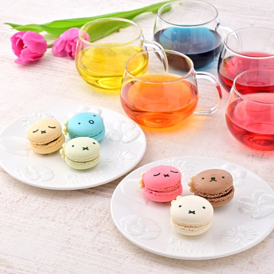 Flower Miffy POP UP SHOP限定ドリンク「フラワーミッフィー フラワーカラフルティー」が、色とりどりのラインアップで登場。ミモザをイメージした黄色いレモングラスティーや、ガーベラを彷彿とさせるオレンジ色のルイボスティーなど全5種のハーブティーにほのかな甘さをプラスしてお届けします。また、フラワーミッフィー ジュースガーデンで販売中のマカロンを3個セットにして販売いたします。「なかよし」と「サプライズ」のそれぞれ味の異なる2種の展開で、常設店にはないお顔のデザインをご用意。お花やグッズと合わせてぜひお楽しみください。
