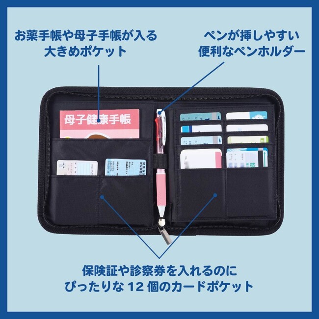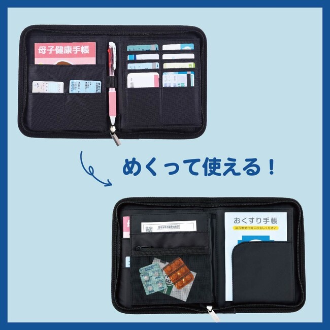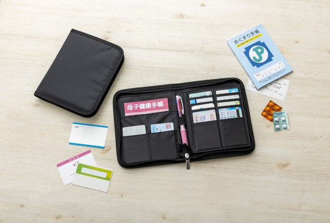 スペシャルアイテムは日本調剤が監修したお薬手帳ケース。このお薬手帳ケースがひとつあれば、お薬、診察券、領収書、お薬手帳など、通院に必要なものが全て入るという便利なアイテムです。診察券などが入るカードポケットが12個と、お薬手帳がぴったり入るポケットが3個あり、ページをめくるようにカードや手帳を探せます。母子手帳ケースとしても使えて、子どもからシニアの方まで幅広く使用できます。