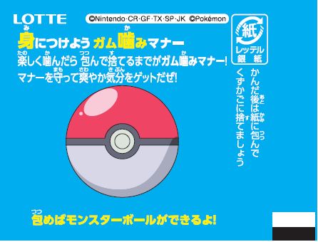 今回は、レッテル(ガムの包み紙)でもクイズなどの紙企画を実施。「噛めば読める!?噛みながら読もうポケモン図鑑」(全7種)、「噛めば閃く!?噛みながら解こうポケモンクイズ」(全12種)、「身につけようガム噛みマナー」(1種)の全20種。
