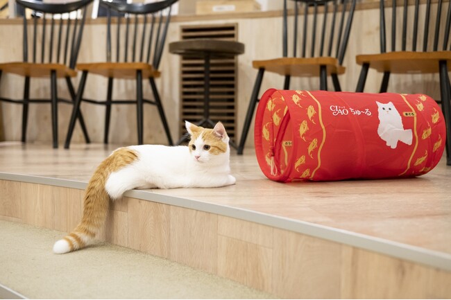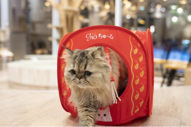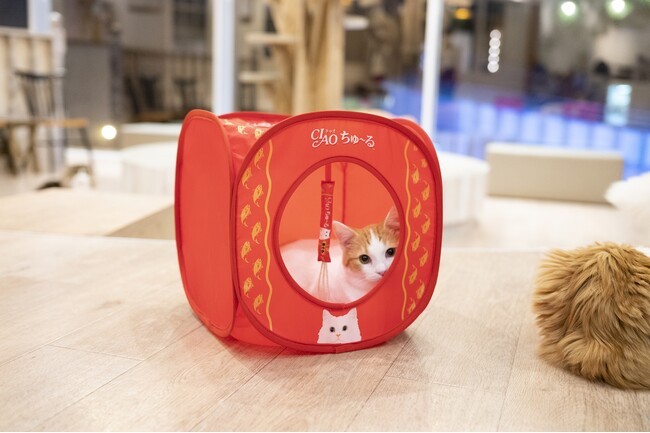 ▲通り抜けられる穴と、上部にも穴があり顔を出せる!通り抜けた先には、ちゅ~るそっくりおもちゃが♪