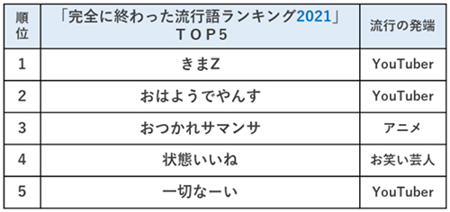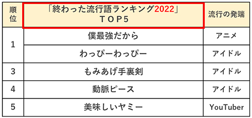 毎年、さまざまな流行語が生まれては消えていきますが、「終わった流行語」を高校生に聞くと、2022年の1位はアニメの登場人物のセリフ「僕最強だから」、アイドルが発端の「わっぴーわっぴー」がランクイン。2021年の同ランキングTOP5を振り返ると、YouTuberやお笑い芸人が発端になったものが主でしたが、それらは高校生の予想通り“終わり”、ランキングも短サイクルで総入れ替えされる結果に。