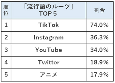 流行語の始まりと終わりは、肌感覚で判断されることが多いですが、高校生に流行語のいわゆる“賞味期限”を聞くと、3ヵ月以内が半数以上と圧倒的で、約9割が1年以内だと感じていることが判明。さらに流行語のルーツを聞くと、上位はSNSが占め、特に「TikTok」が7割超、またSNS以外では5位にアニメがランクインという結果に。