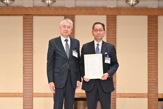 表彰式での受賞の様子。左は日本ホテル協会副会長・日本ホテル株式会社 取締役会長の里見雅行。右がホテルメトロポリタン エドモント 取締役総支配人の松田秀明。
