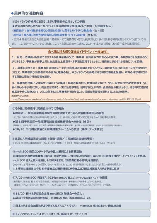 政府が食品ロスの半減目標を設定した中、「食べ残し」の持ち帰りの推進が必要となっているが、踏み出せないホテルが多い。消費者庁及び厚労省の食べ残しの持ち帰りに関するガイドライン作成検討会にホテル事業者の立場として参画し、管理責任の明確化や法的責任、保健所からの指導の明確化の必要性などを提言。