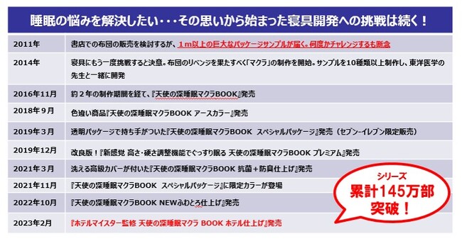 読者の多くが睡眠に悩みを抱えていると知った編集者が約2年の制作期間を経て2016年に第1弾となる『天使の深睡眠マクラBOOK』を発売。これまでに全5種を発売し、シリーズ累計145万部を突破。発売以来、「ずっと眠れず悩んでいましたが解決しました」「家族の分もまとめて購入しました」といったお手紙やお電話を多数いただき好評を得ています。
