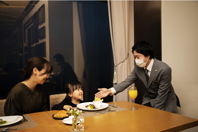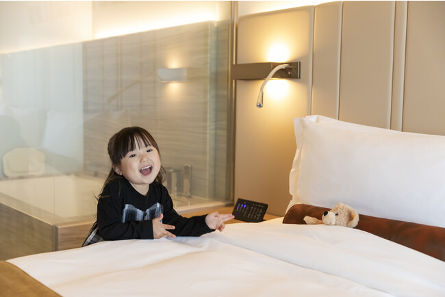 ホテルデビューチャレンジは、フロントでのチェックインからスタート。客室番号を探してお部屋まで到着できたら、“旅育”を一緒に体験するお友達のテディベア「フィン」を探します。お部屋では、ウェルカムドリンクを作りながらバーテンダー気分をお楽しみいただけます。ディナーは、夜景を望めるレストランで、おとなと一緒に楽しめるお子さま用のコース料理をご用意。スタッフのレクチャーを聞きながらテーブルマナーを学びます。