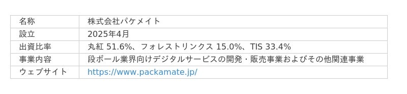 丸紅株式会社(以下、「丸紅」)と、丸紅フォレストリンクス株式会社(以下、「フォレストリンクス」)、TIS株式会社(以下、「TIS」)は、段ボール業界向けにDX/GXソリューション事業を展開するための合弁会社「株式会社パケメイト(以下、「パケメイト社」)」を2025年4月1日に設立しました。