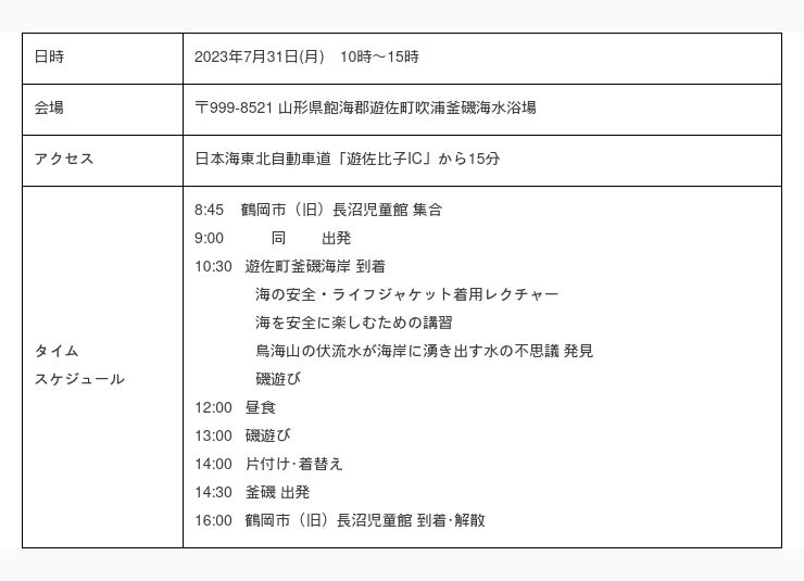日時:2023年7月31日(月) 10時~15時 開催場所:遊佐町釜磯海岸