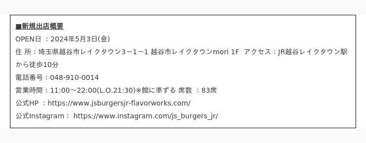 株式会社ベイクルーズ(本社: 東京都渋谷区、取締役CEO: 杉村 茂)が運営する、アメリカンハンバーガーショップ「J.S. BURGERS CAFE」より、新たなコンセプトを掲げる新ブランド「J.S. BURGERS Jr.(ジェイエスバーガーズジュニア)」が2024年5月3日(金)、越谷レイクタウンmoriに初出店いたします。