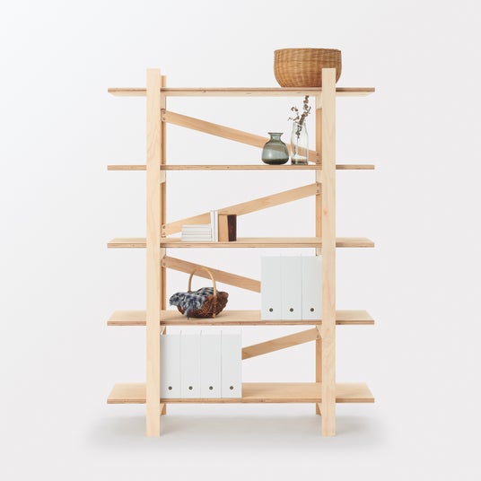 高さ2段・3段のシェルフは、オフィス空間をやわらかく間仕切ったり、レセプション・応接スペース等の飾り棚としての使用がおすすめです。帆立の内寸には、無印良品のファイルボックスや収納用品がぴったり収まります。また、オプションパーツを使用することで横連結できるほか、棚板をお好きな樹種や地域産材に変えることもできます。