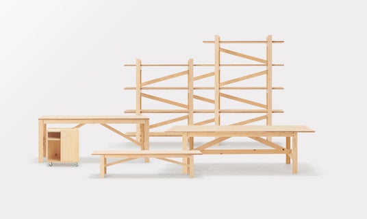 今回発売する「ボードファニチャー T字脚」は、木を余すことなく活用し、素材感を生かした多様な板(ボード)を取り揃えた「素材を生かしたボードシリーズ*」の新しい展開で、T字脚と板(ボード)をジョイントすることで、さまざまなサイズや素材のデスク、テーブル、シェルフ、ワゴン、ベンチをつくりました。