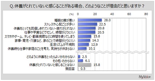 休養が『とれていない』と回答した人では、「ストレスや心配ごとが多い」「仕事や学業で忙しく、時間がとりにくい」が上位2位となっています。