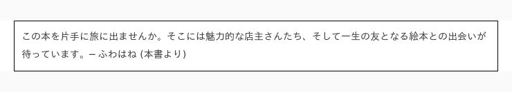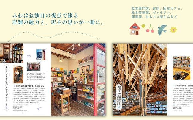 本書は、「絵本のつなぎて」として絵本の作り手と読み手、親子の時間をつなぐ活動をしているふわはねによる、初の著書。約1年半かけて、22都道府県の絵本専門店、書店、絵本美術館、絵本カフェ、ギャラリー、図書館、おもちゃ屋さんなど130軒をめぐり、店員と直接話し、自らのカメラでその魅力をおさめました。