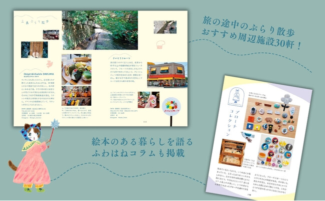 旅の途中に、ぶらりと訪れた場所も見逃せません。店舗めぐりの旅を更に豊かにしてくれる、周辺のおすすめスポット30軒を紹介。また、絵本のある生活を語る「ふわはねコラム」も掲載しています。装画やイラストは、絵本作家の布川愛子さん。手のひらサイズで軽量、旅のお供にもぴったりです。
