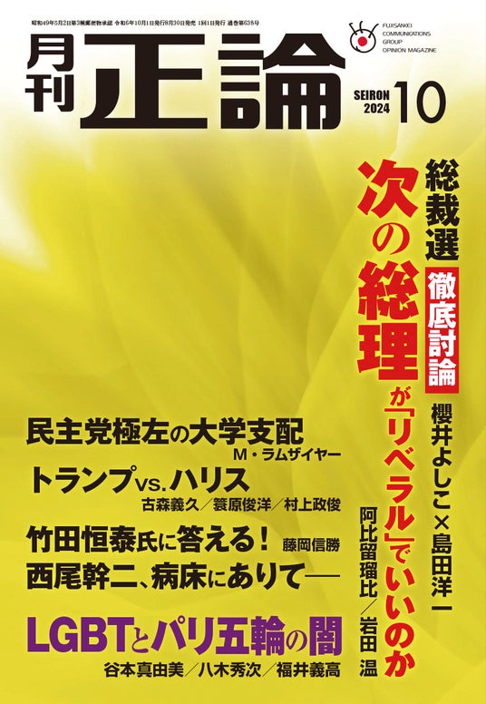 産経新聞社は、日本の針路を考える論壇誌、月刊「正論」の2024年10月号を8月30日(金)に発売しました。9月27日開票の自民党総裁選や11月の米大統領選で、日米の新しいリーダーが決まります。大特集「総裁選は?大統領選は?」では、ジャーナリストの櫻井よしこ氏と福井県立大学名誉教授の島田洋一氏の徹底討論や、産経新聞政治部編集委員兼論説委員の阿比留瑠比氏、政治学者の岩田温氏らの寄稿論文が掲載されています。このほか正論ならではの舌鋒(ぜっぽう)鋭い連載もあり、読み応えのある内容です。