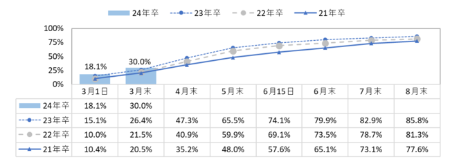 2024年卒の大学生・大学院生の3月末時点の内々定率は前年比3.6pt増の30.0%【図1、2】