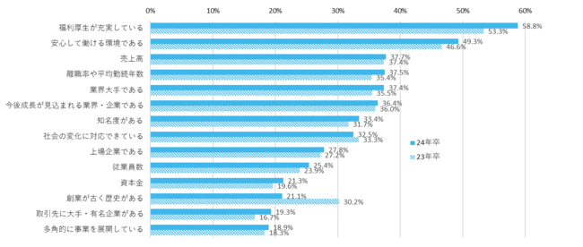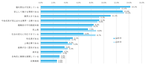 企業に安定性を感じる点は「福利厚生が充実している」が最多。「離職率や平均勤続年数」が前年比で増加し、長く働ける環境を重視する傾向に【図3、4】