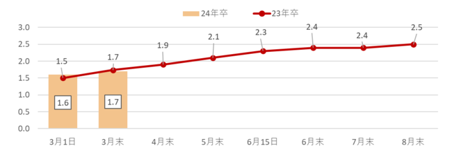2024年卒業予定の大学生・大学院生の3月末時点での内々定率は前年比3.6pt増の30.0%となり、平均内々定保有社数は前年と同値の1.7社だった。3月上旬に引き続き、内々定率・平均内々定保有社数ともに高い水準で推移している。【図1、2】