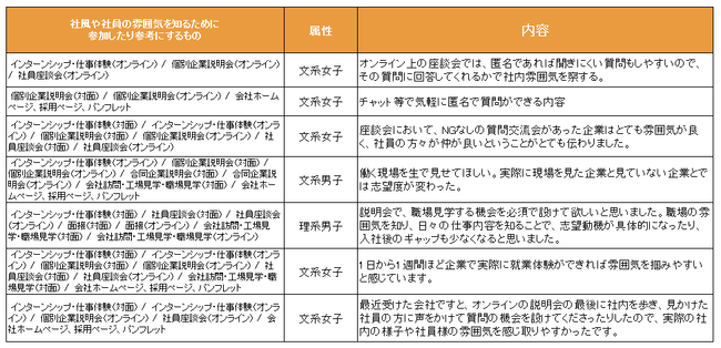 企業の社風や社員の雰囲気を感じるために、参加したり参考にするものを選んでもらったところ、「インターンシップ・仕事体験(対面)」が最多で57.9%だった。次いで「個別企業説明会(オンライン)」(50.7%)、「インターンシップ・仕事体験(オンライン)」(47.9%)となり、オンライン実施の項目も上位に入った。自由回答では「実際に(働く)現場を見た企業と見ていない企業とでは志望度が変わった」と対面でしか得られない情報を求める意見や、「チャット等で気軽に匿名で質問ができる」などのオンラインならではのメリットを感じている意見、オンライン社内ツアーで社員と質問する機会を得られたという声も見られた。対面ではもちろん、企業の工夫によってはオンラインでも社風を十分に感じられるようになっているようだ。【図5、6】