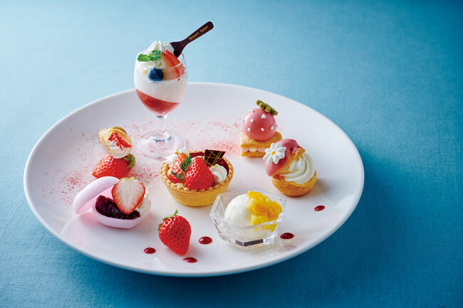 パンナコッタに果肉入りの苺ジュレを合わせたグラスデザートや、ポップな真ん丸デザインに仕上げた苺のムースボール、あんことマスカルポーネクリーム・苺をはさんだハート型の最中、クレープなど苺のミニスイーツ6品に、苺とお口直しのミルクアイスクリームをプラスした全8品が集います。