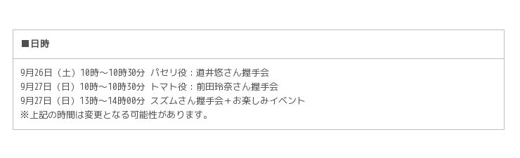さらに、アニメ版の声優を担当した道井悠さん(パセリ役)・前田玲奈さん(トマト役)の握手会を開催いたします。また、楽曲制作を担当した静岡県出身のマルチクリエイター、スズムさんのお楽しみイベントも同時開催されます。