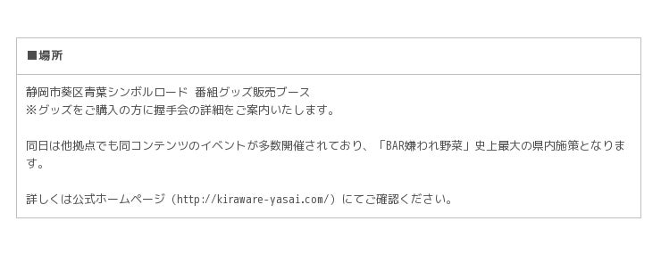 2015年9月26日(土)から27日(日)までの2日間、葵スクエア・青葉シンボルロード(静岡県静岡市葵区)にて開催される静岡朝日テレビ主催の「あさひテレビ祭り~食と笑いの大収穫祭~」において、今春よりKADOKAWAと静岡朝日テレビが手がけているキャラクターコンテンツ「BAR 嫌われ野菜」とのコラボブースが出展いたします。