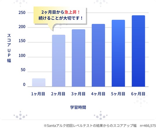 Santaアルクでは、累計45万人以上の学習ログを分析し、AIが一人一人の弱点や学習状況に応じてスコアアップのために最適な問題を出題しています。その結果、1日10分の学習を継続した場合、学習期間に応じて、以下のスコアアップが達成されていることを確認しました。
