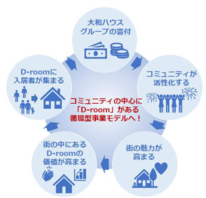 街の魅力が高まることで、街の中にある「D-room」の価値も向上し、その結果、賃貸住宅にもご入居者が集まるという、新たなモデルを確立させることで、「D-room」ブランドの価値向上を目指します。