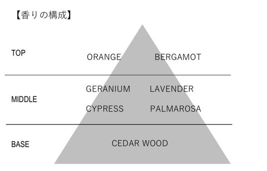 オレンジ、ベルガモット、ゼラニウム、ラベンダー、ヒノキ、パルマローザ、シダーウッド鎮静と高揚、安定と調和。7種類の植物のエレメントがあらゆるバランスを整える。身体の芯を呼び覚ます、オレンジとベルガモットのフレッシュなトップノート。匂いたつゼラニウムやパルマローザのクリーンなフローラル、最後は森の空気をまとうような済んだシダーウッドが、手肌を繊細な香りで包み込む。