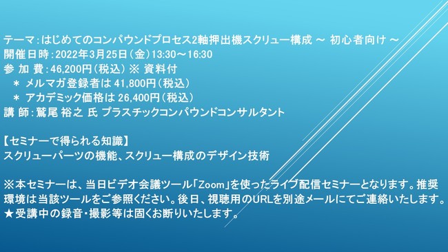 先端技術情報や市場情報を提供している(株)シーエムシー・リサーチ(千代田区神田錦町: https://cmcre.com/ )では、 各種材料・化学品などの市場動向・技術動向のセミナーや書籍発行を行っておりますが、 このたび「はじめてのコンパウンドプロセス2軸押出機スクリュー構成 ~ 初心者向け ~」と題するセミナーを、 講師に鷲尾 裕之 氏 プラスチックコンパウンドコンサルタント)をお迎えし、2022年3月25日(金)13:30より、 ZOOMを利用したライブ配信で開催いたします。 受講料は、 一般:46,200円(税込)、 弊社メルマガ会員:41,800円(税込)、 アカデミック価格は26,400円(税込)となっております(資料付)。