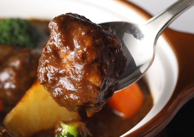 今回は、ベースミートに味をしみこませることと、アクセントとして、形成したベースミートに焦げ目をつけて本物の牛肉の状態にさらに近づけることを特に意識しました。ゴロっとした存在感のあるお肉は、まるで長時間煮込んだようなやわらかさで、植物性だけで出来ているとは思えない深いコクと旨みのあるおいしさに。口に入れた瞬間に本物のビーフシチューと間違えること必至の『大豆ミートシチュー』を是非体感ください。