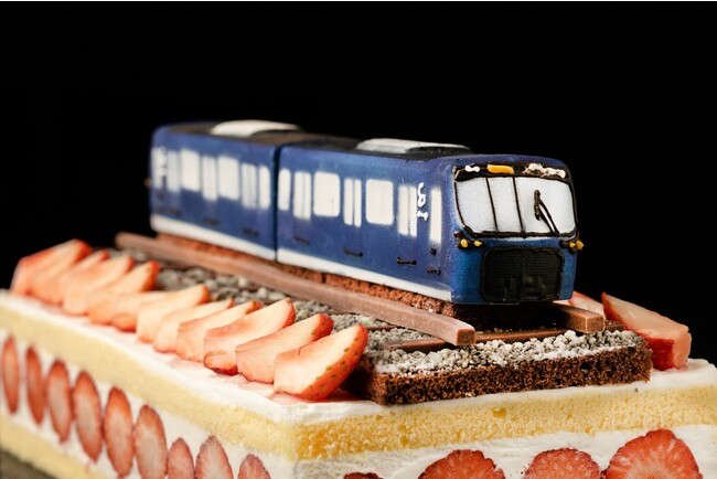 印象的なカラーリング「YOKOHAMA NAVYBLUE(ヨコハマネイビーブルー)」の21000系車両が線路を走る様子を再現し、車両と線路、バラストと呼ばれる砂利は、チョコレートを使用し精巧に再現。土台はイチゴをふんだんに使用したショートケーキで作られております。