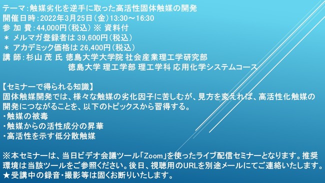 先端技術情報や市場情報を提供している(株)シーエムシー・リサーチ(千代田区神田錦町: https://cmcre.com/ )では、 各種材料・化学品などの市場動向・技術動向のセミナーや書籍発行を行っておりますが、 このたび「触媒劣化を逆手に取った高活性固体触媒の開発」と題するセミナーを、 講師に杉山 茂 氏 徳島大学大学院 社会産業理工学研究部 徳島大学 理工学部 理工学科 応用化学システムコース)をお迎えし、2022年3月25日(金)13:30より、 ZOOMを利用したライブ配信で開催いたします。 受講料は、 一般:44,000円(税込)、 弊社メルマガ会員:39,600円(税込)、 アカデミック価格は26,400円(税込)となっております(資料付)。