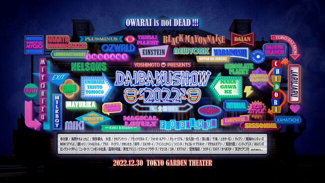 このたび、吉本興業株式会社主催イベント YOSHIMOTO presents 『DAIBAKUSHOW 2022』を開催することが決定いたしました。新型コロナ禍の中2020年12月30日に有明・東京ガーデンシアターで初開催された、舞台で観るから面白いネタ、絶対に客席で観たい舞台。その年日本中を笑いで彩った芸人達が50組超出演する、全てが豪華な世界最大級のネタの祭典が3年目を迎え本年も東京ガーデンシアターで、のべ14000人のお客様を前に開催することが決定しました。