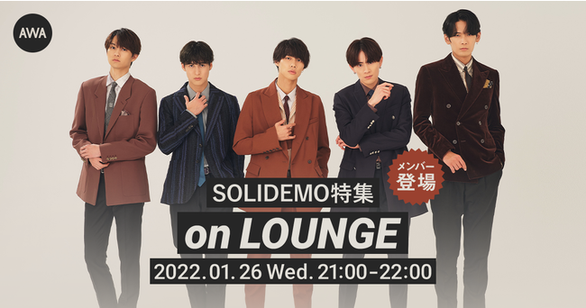 AWA株式会社(本社:東京都港区、代表取締役CEO:冨樫晃己)が運営する、サブスクリプション型(定額制)音楽ストリーミングサービス「AWA(アワ)」は、2022年1月26日(水) 21:00~22:00の1時間に渡り、オンライン空間「LOUNGE」で、SOLIDEMOのメンバー登場イベントを開催いたします。