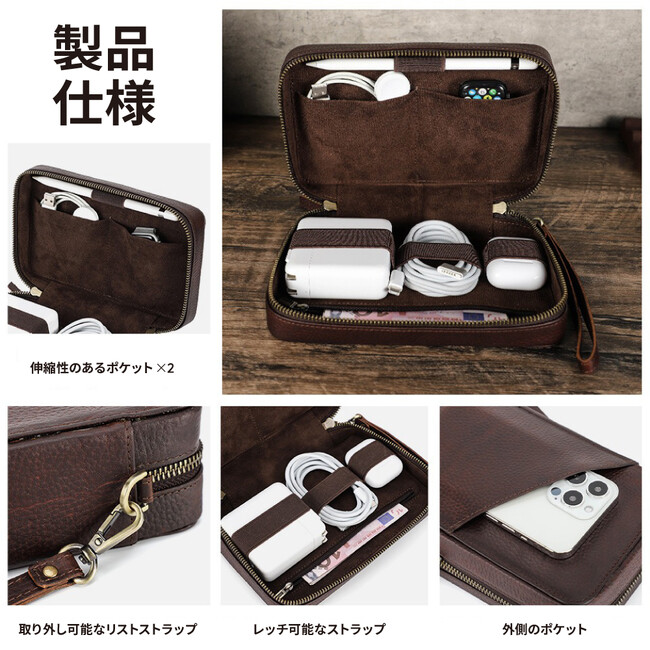 Guxury-Pouchは複数のポケットとケーブルを止めるゴムが付いているデザイン。