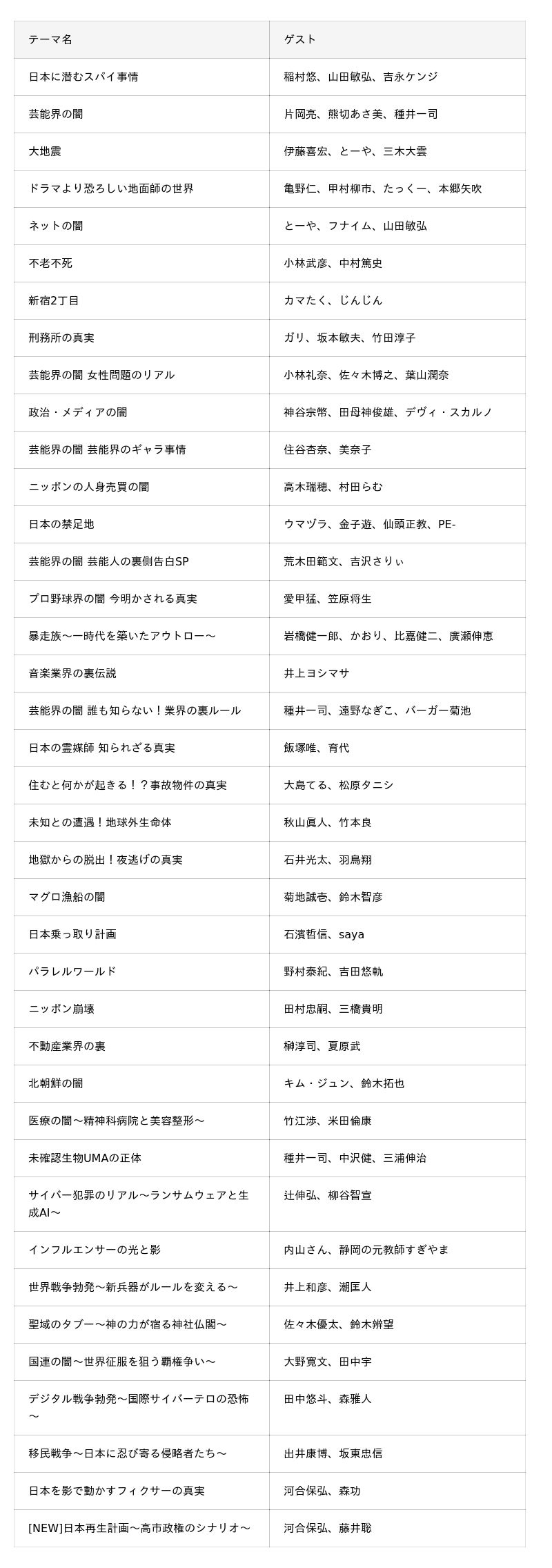 都市伝説――それはもう、誰もが知る「表の話」。でも、まだ表に出ていない“裏話”があるんです。そこには、真実に近づくためのヒントが隠されているかもしれません。Mr.都市伝説・関暁夫がこれまで伝えてきたこと、「そんなの信じられない」と思った人も多いでしょう。でも振り返ってみてください。その言葉、意外と“嘘じゃない”と思いませんか?