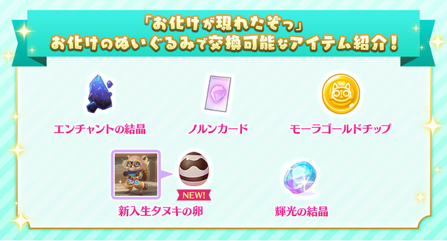 討伐報酬として「お化けのぬいぐるみ」などがゲットできます。集めた「お化けのぬいぐるみ」は、新登場のペット「新入生タヌキの卵」や「エンチャントの結晶」「ノルンカード」など、さまざまなアイテムと交換することができます。