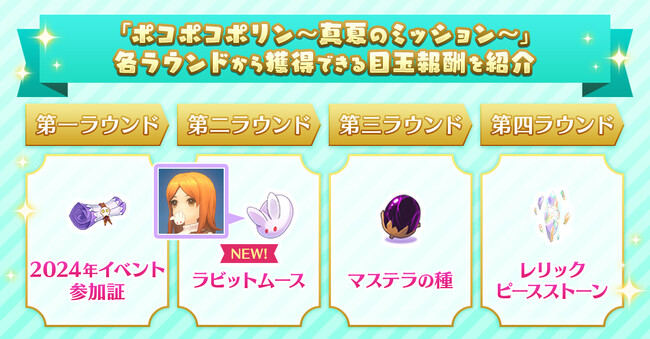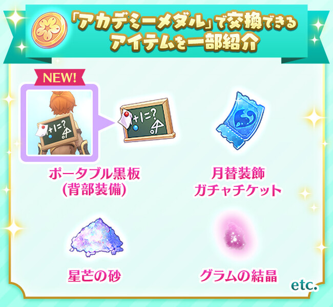 さらに、「モンスター討伐」では新頭装備「アングリーチョーク」が、「ポコポコポリン」では新口装備「ラビットムース」がそれぞれ手に入り、対象イベントで手に入る「アカデミーメダル」を集めると新背部装備「ポータブル黒板」と交換することができます。