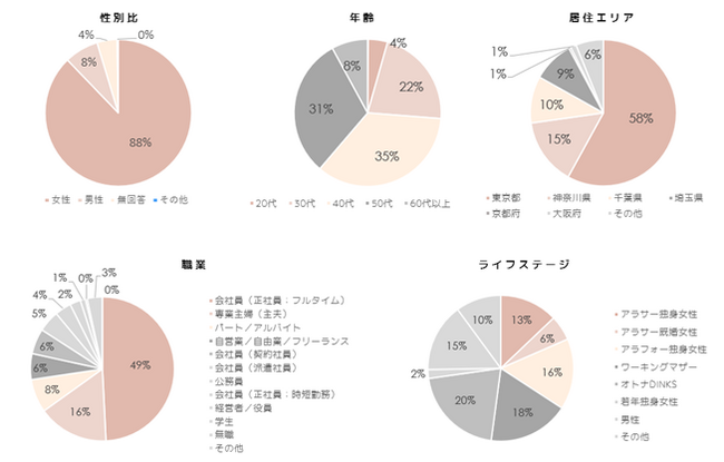 【ライフステージ】 アラサー独身女性(25~34歳・独身・有職女性):13%、アラサー既婚女性(25~34歳・既婚・子供なし・有職女性):6%、アラフォー独身女性(35~39歳・独身・有職女性):16%、ワーキングマザー(20~49歳・18歳までの子供あり・有職女性):18%、オトナDINKS(35~49歳・既婚・子供なし・有職女性):20%、若年独身女性(20~24歳・独身・有職女性):2%、男性(有職男性すべて):15%、その他(上記以外):11%