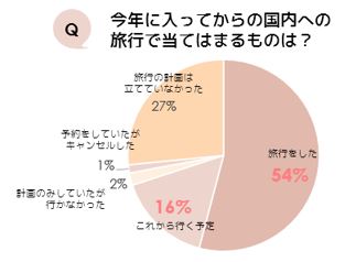 A、旅行をした:54%、これから行く予定:16%、計画のみしていたが行かなかった:2%、予約をしていたがキャンセルした:1%、旅行の計画は立てていなかった:27%