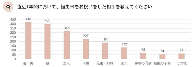 直近1年間で誕生日をお祝いした相手は、1位「妻・夫」、2位「親」、3位「友人」という結果に。