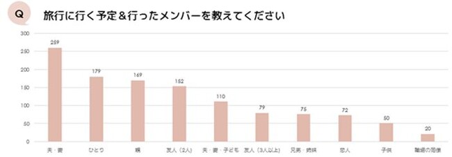 旅行に行く予定または行ったメンバーも、1位「妻・夫」、2位「ひとり」、3位「親」と、「ひとり」と「親」が「友人」を抜いてランクイン。