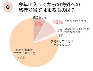 A、旅行をした:8%、これから行く予定:10%、計画のみしていたが行かなかった:2%、予約をしていたがキャンセルした:1%、旅行の計画は立てていなかった:79%