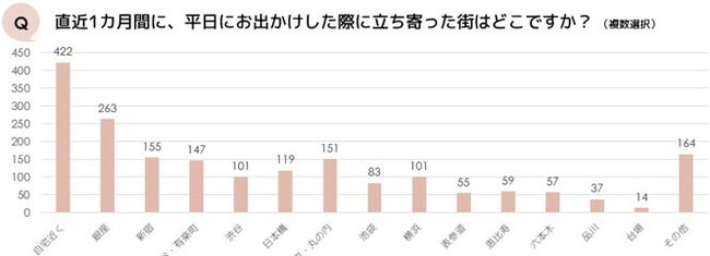 A、自宅近く:422、銀座:263、新宿:155、日比谷・有楽町:147、渋谷:101、日本橋:119、大手町・丸の内:151、池袋:83、横浜:101、表参道:55、恵比寿:59、六本木:57、品川:37、台場:14、その他:164