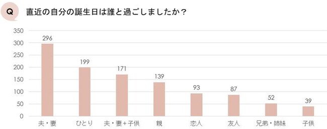 直近の自分の誕生日を過ごした相手は、1位「妻・夫」、2位「ひとり」、3位「妻・夫+子供」と、ひとりや家族という選択肢が増えました。