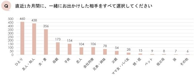 直近1カ月でおでかけした相手を聞いたところ、1位「ひとり」、2位「友人・知人」、3位「夫・妻」という結果となりました。また「母親」も4位にランクインしており、母娘でのおでかけも多いことが分かります。